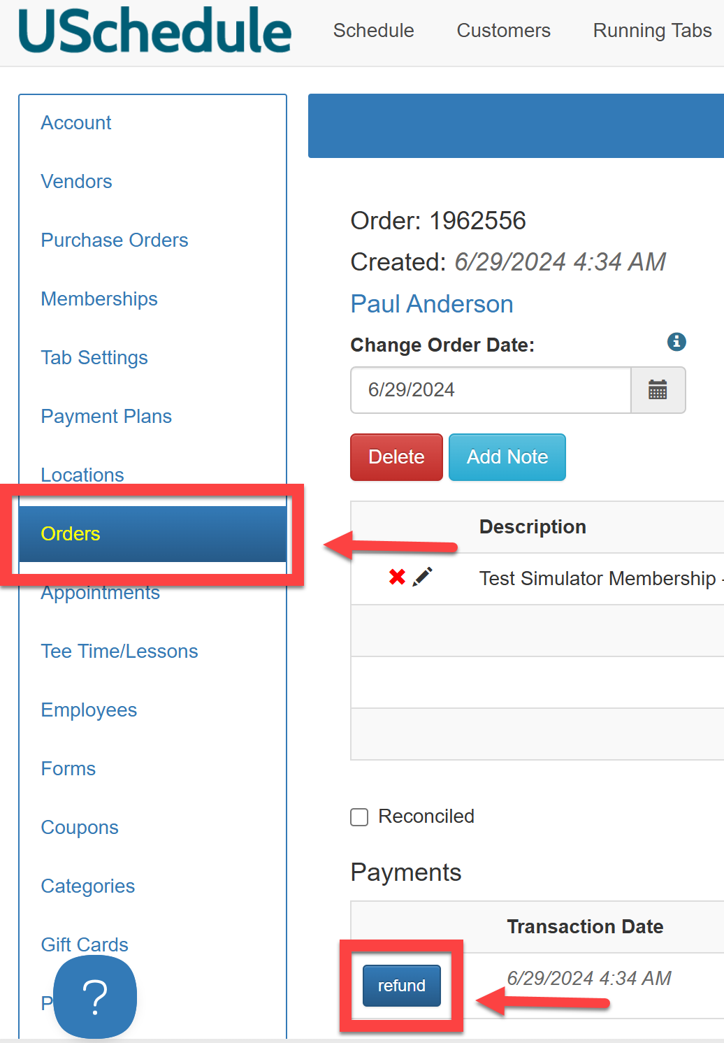 Select Orders and choose the relevant order you would like to refund to the customer. Click the blue refund button: