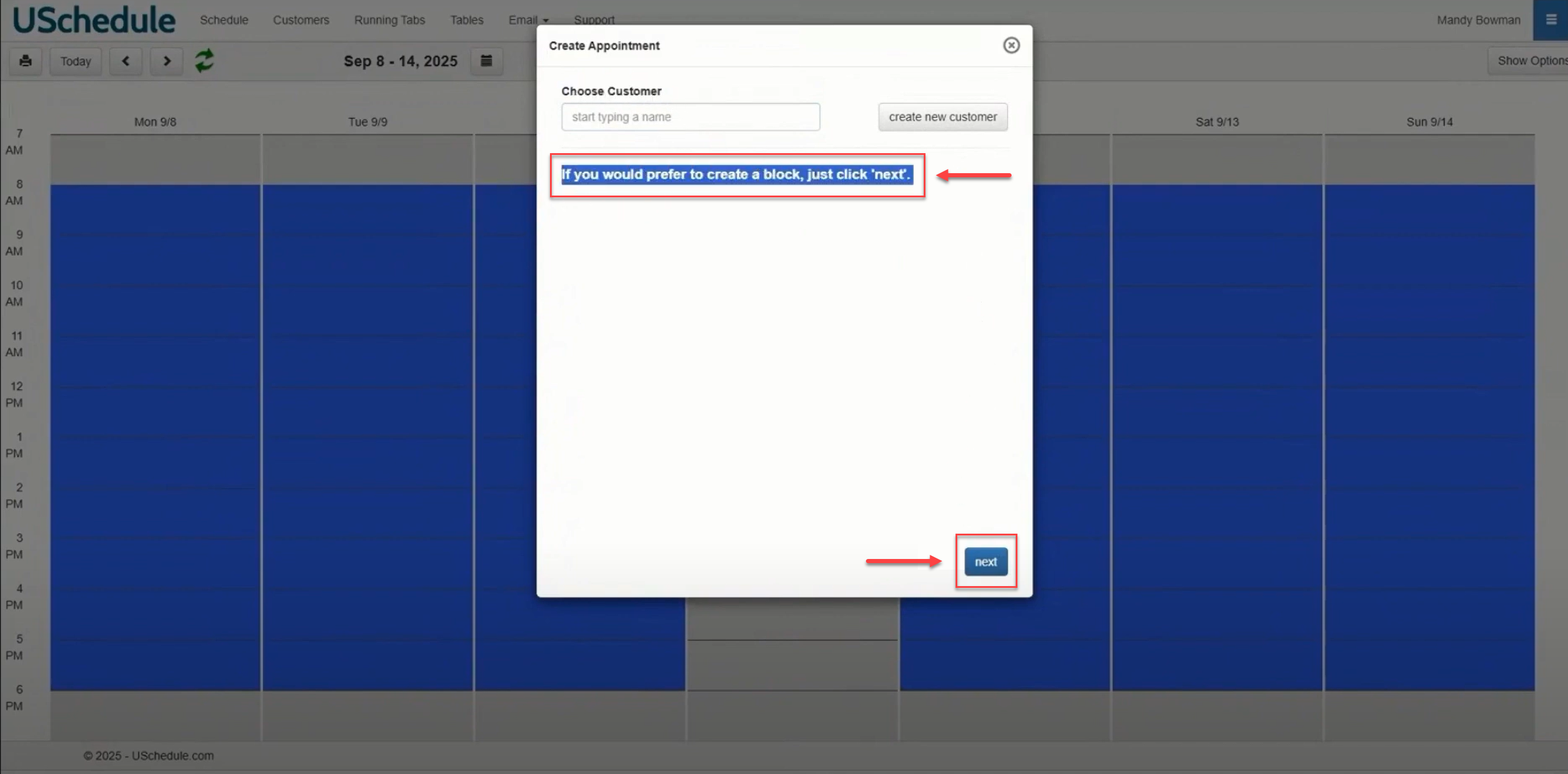 To start your block, click on your calendar on the first day that you would like to create the recurrence and click Next.