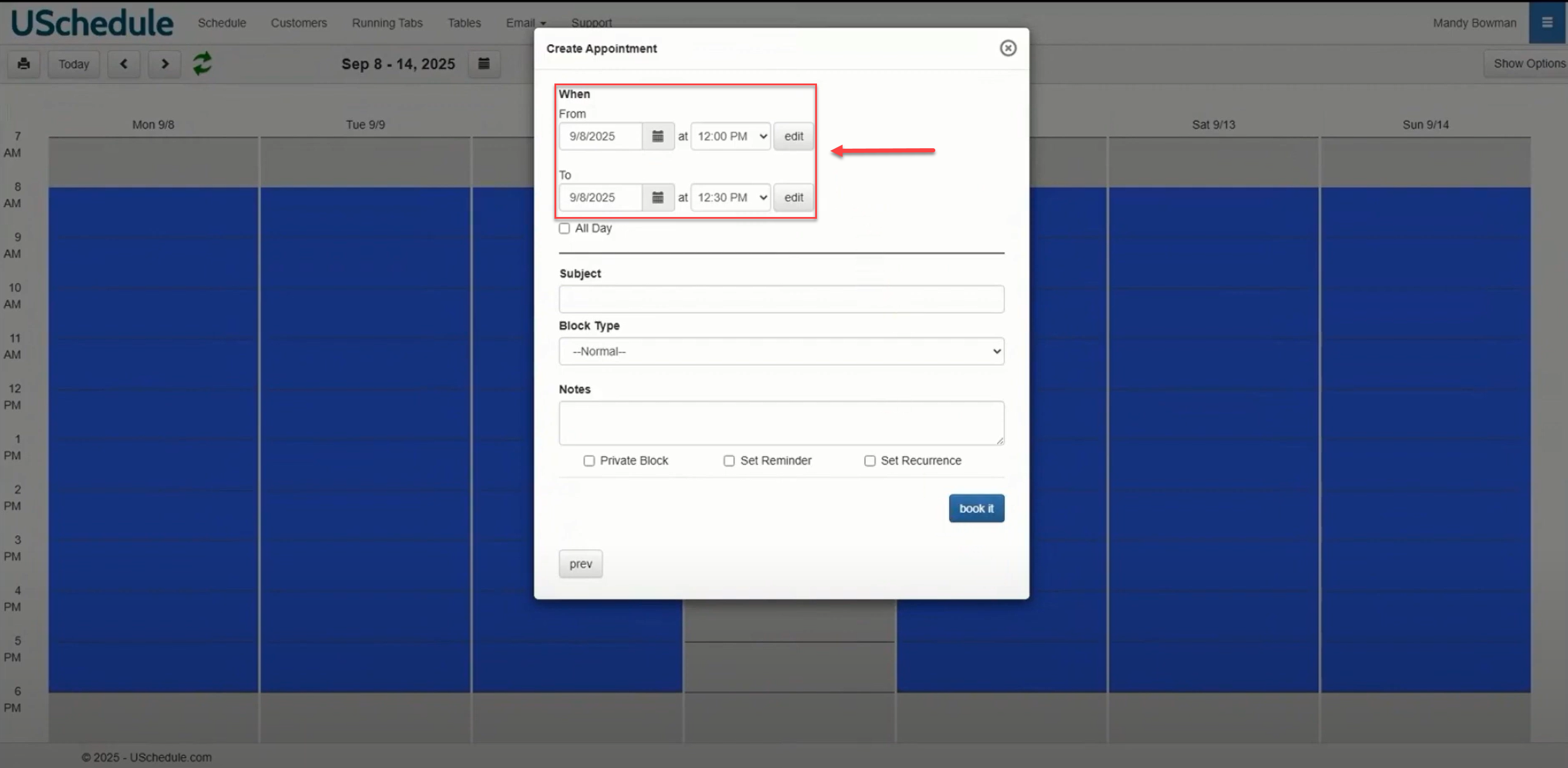 Set the parameters for the first day of the block. Note that the click on your calendar sets the first date. The end date is the same, and the start time is preset as well.