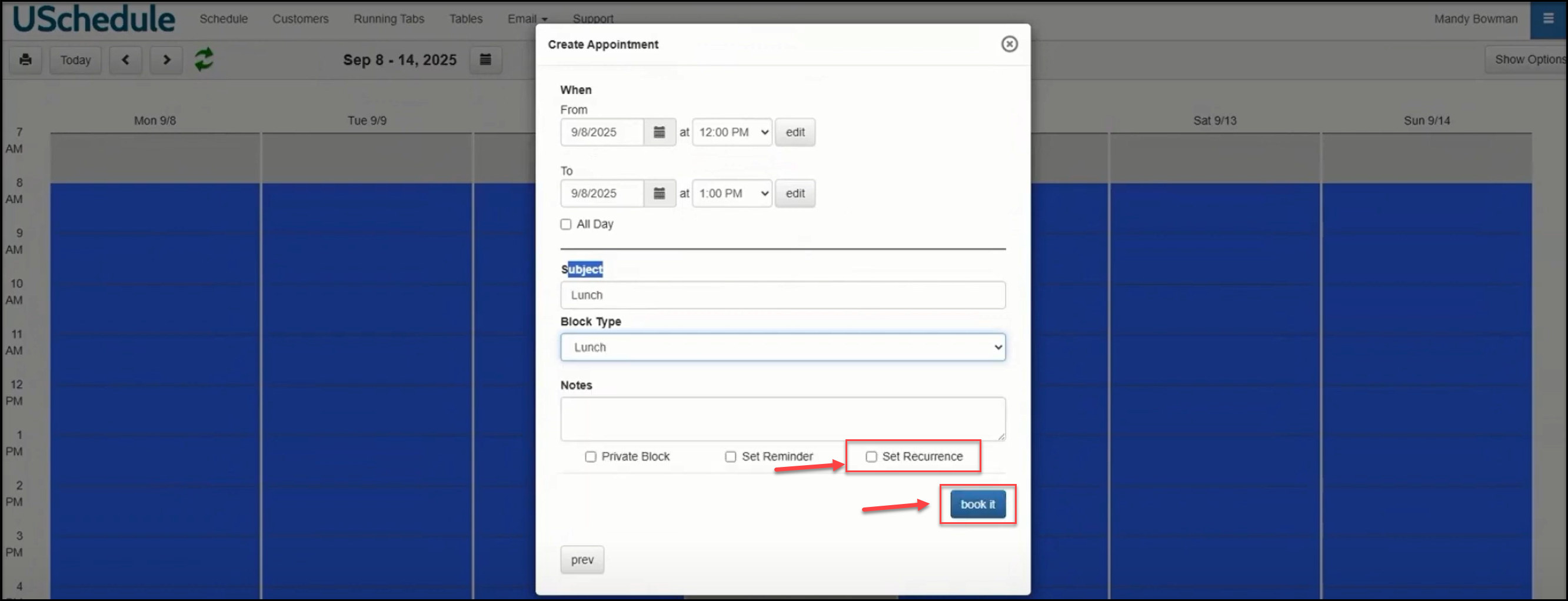 Click the Set Recurrence check box and click the book it button.