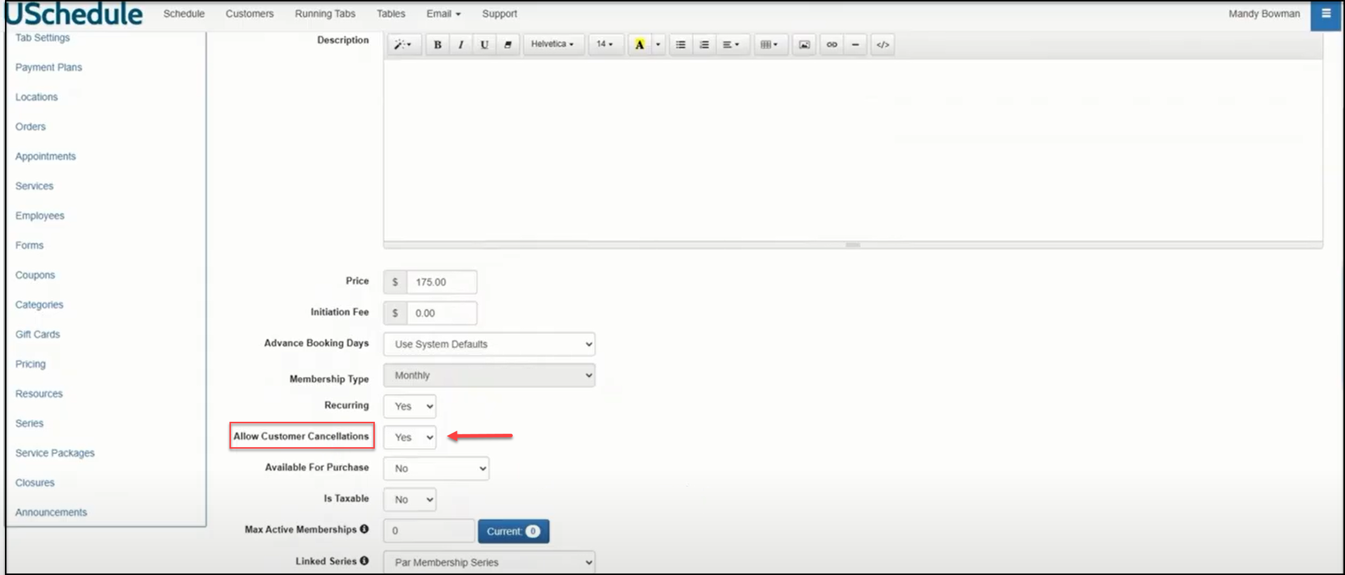 Set Allow Customer Cancellations to Yes. This will allow your customers to cancel their own memberships at any time.