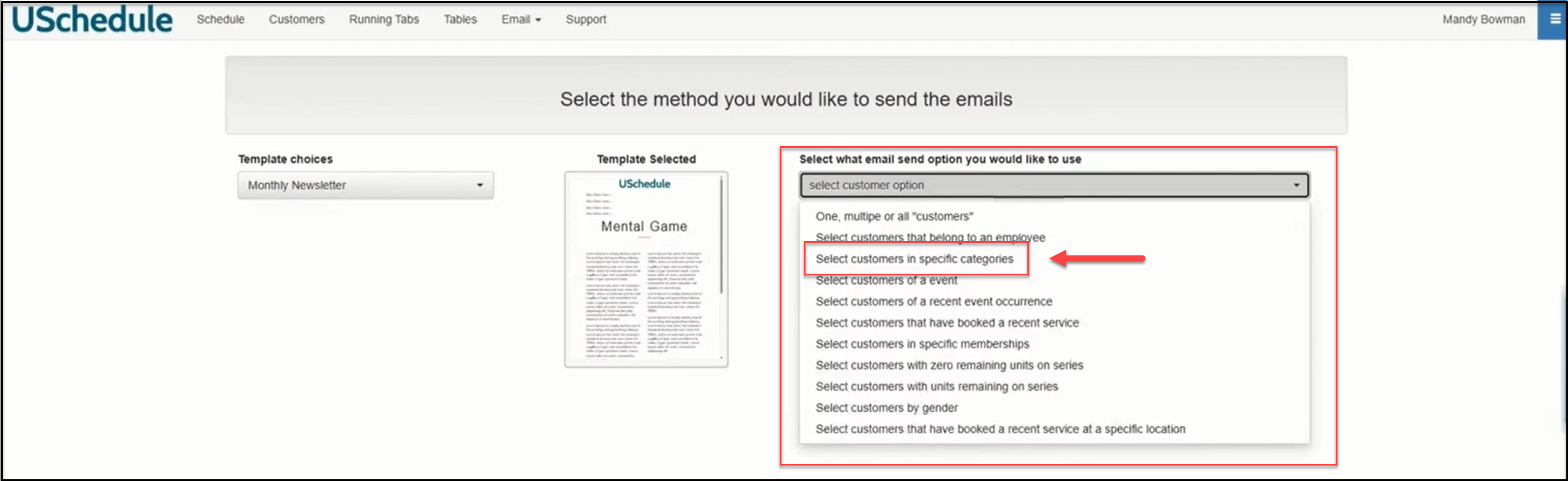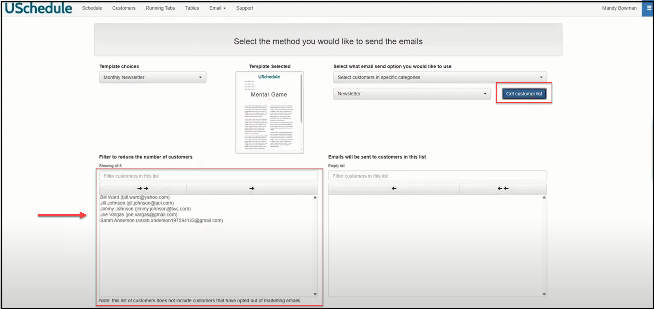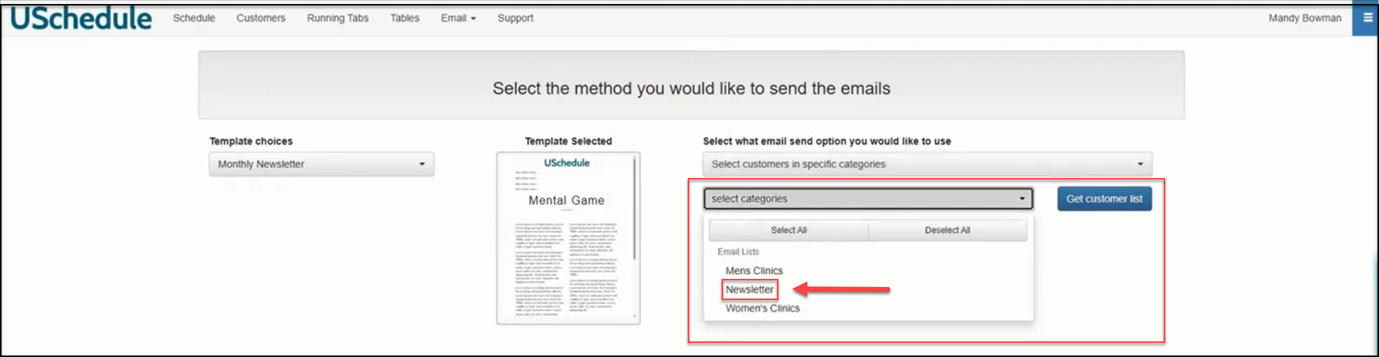 Select Newsletter and click Get customer list. This will reveal everyone who has selected that category in their profile: