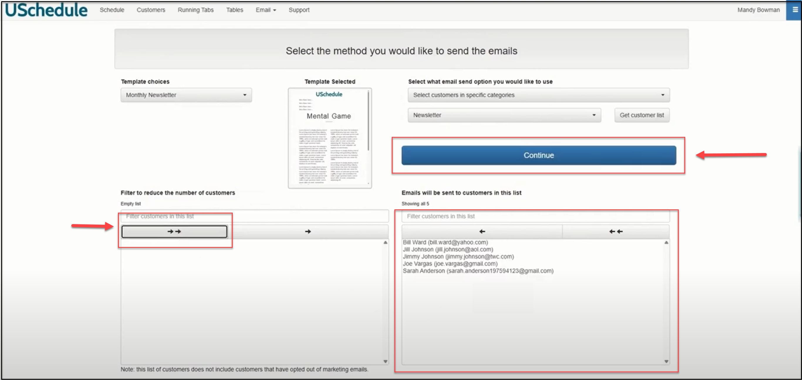 If you want to send the newsletter to everyone on the list, click the double arrow button. This moves those over to the selected list. Click Continue: