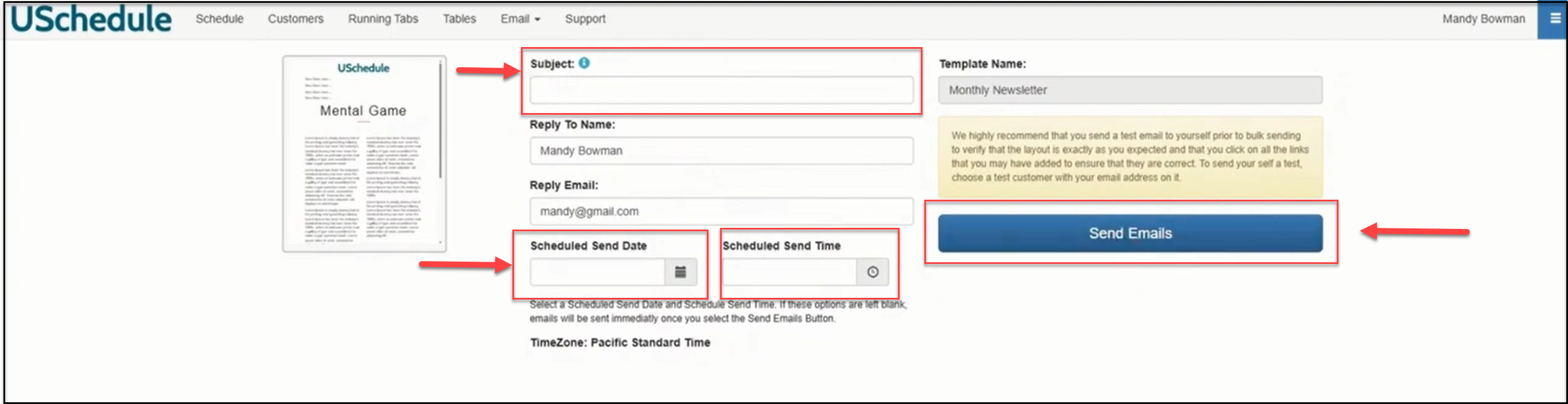 Add your Subject, and you can include a Scheduled Send Date and a Scheduled Send Time.