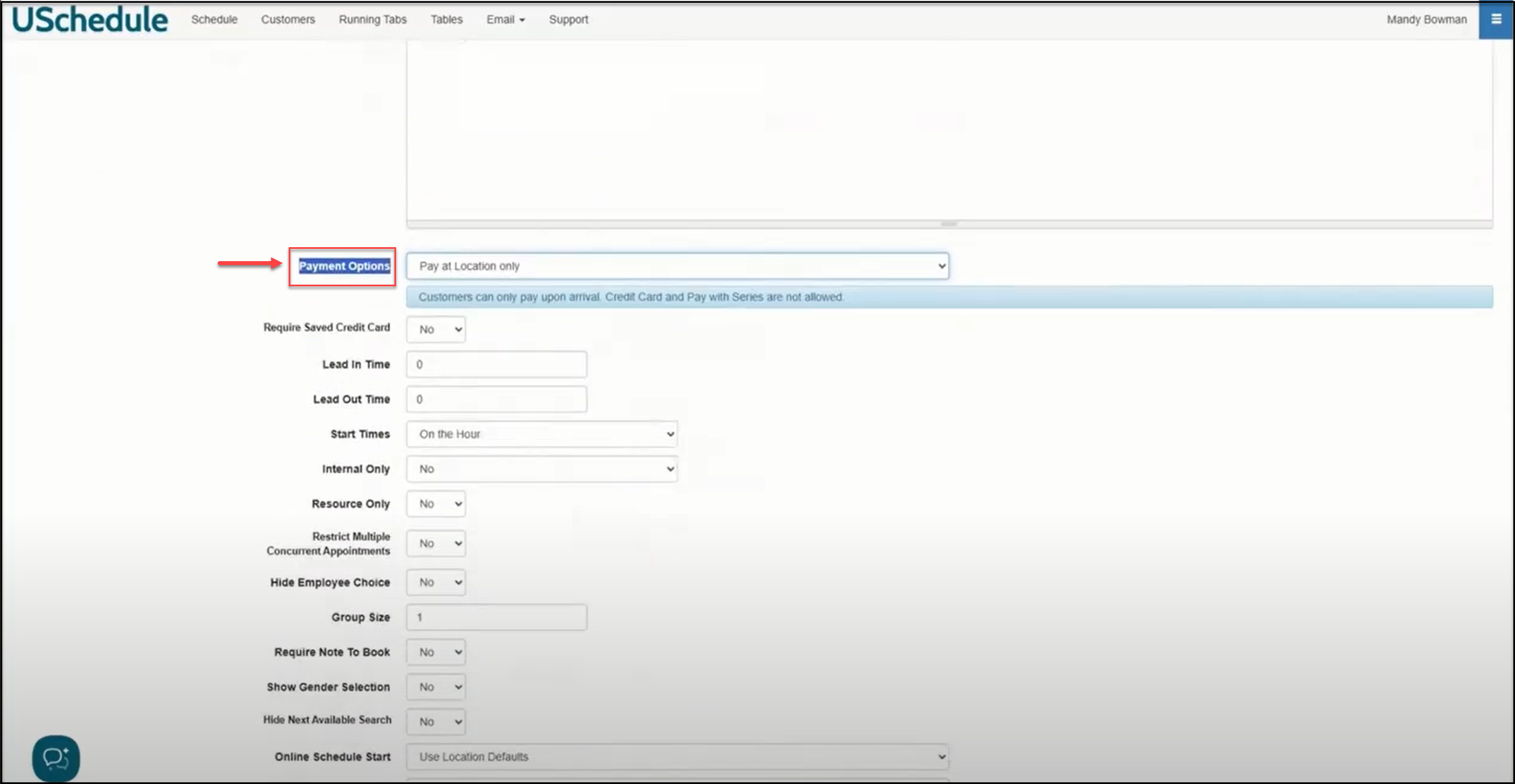 Set Payment Options to Pay at Location Only. This means the customer will book without paying: