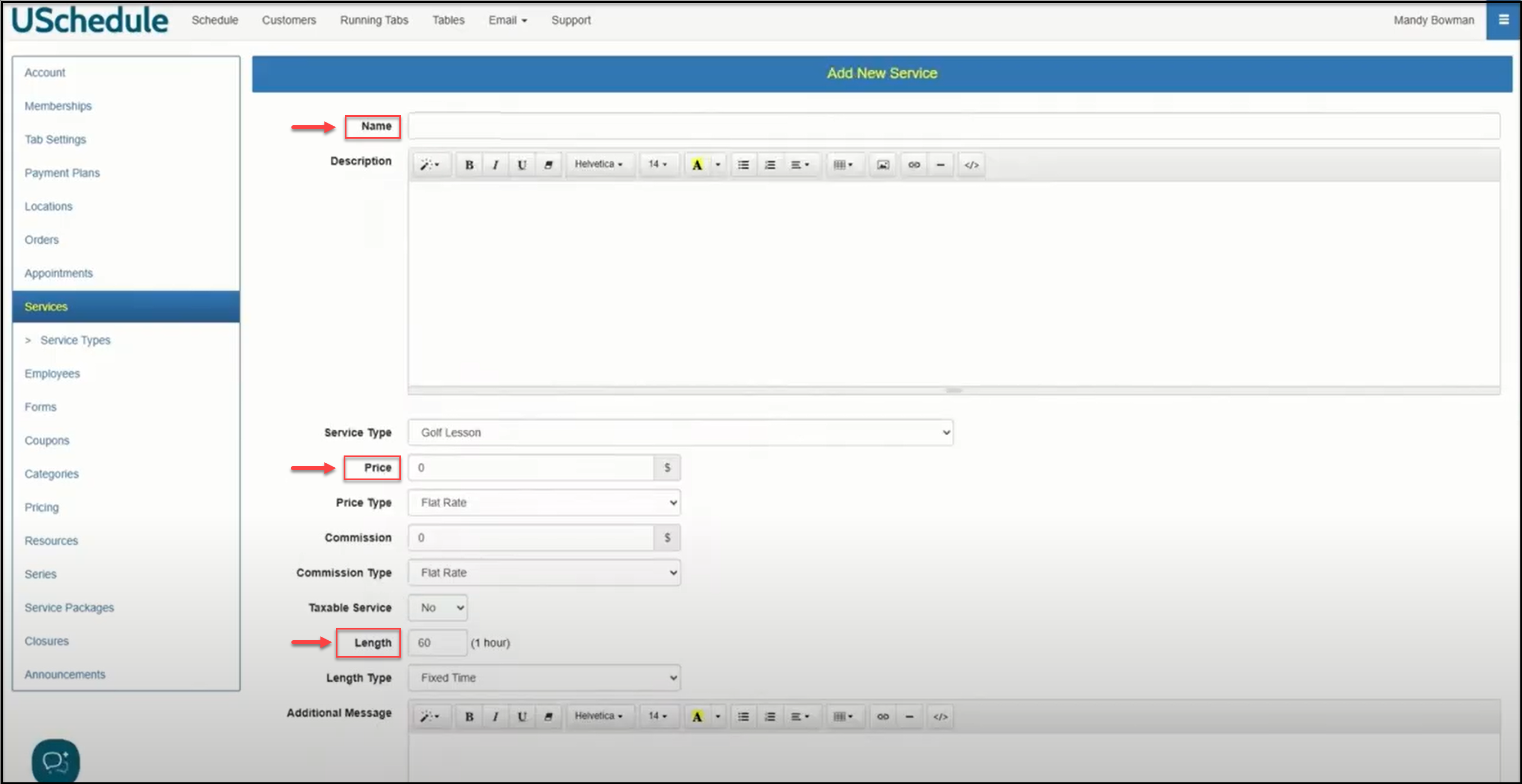 Add a Name for the new service. Since it will be free, leave the Price set at 0, and set the Length of the service: