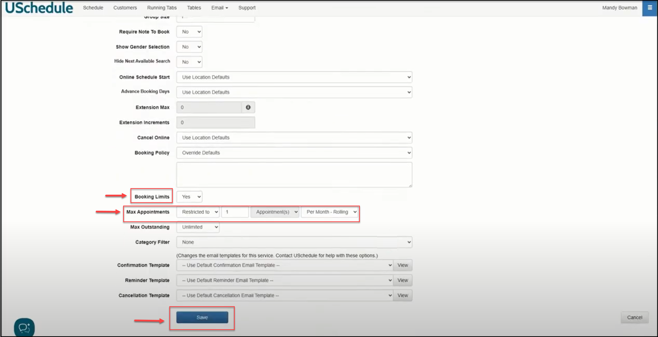 Near the bottom of this page is where you will set Booking Limits. Set this to Yes and set the Max Appointments restriction to 1 appointment per month. This membership has recurring billing so use the Per Month Rolling option and click Save.