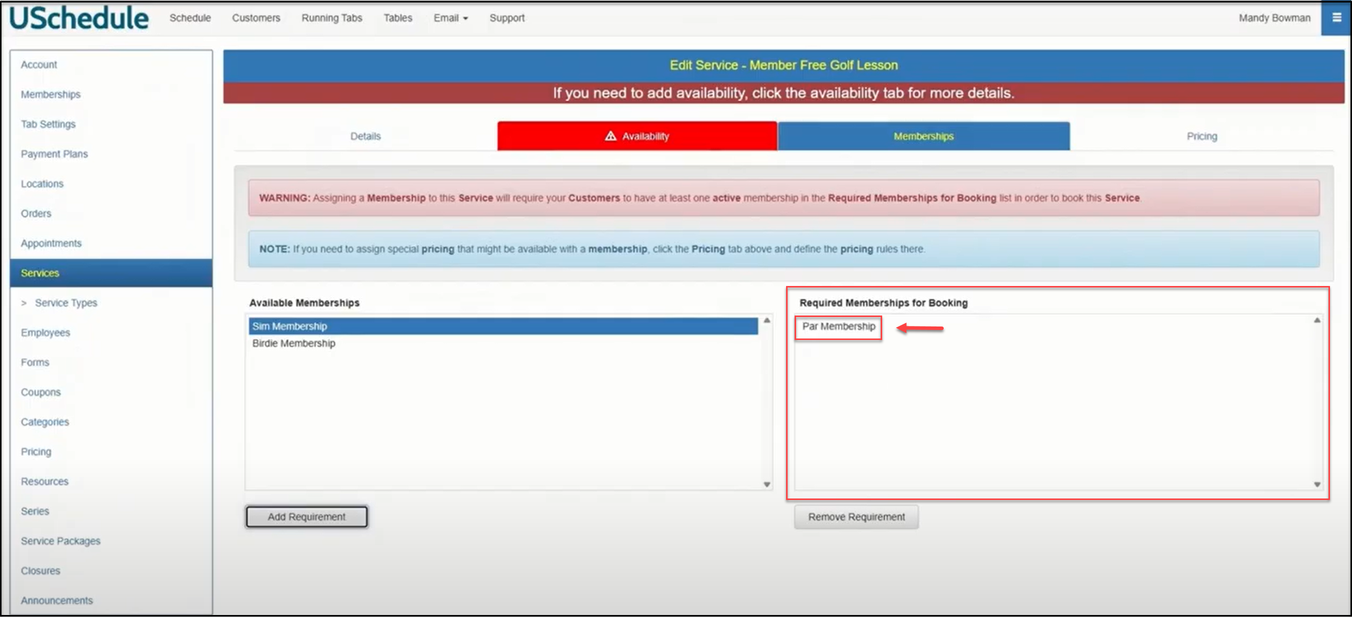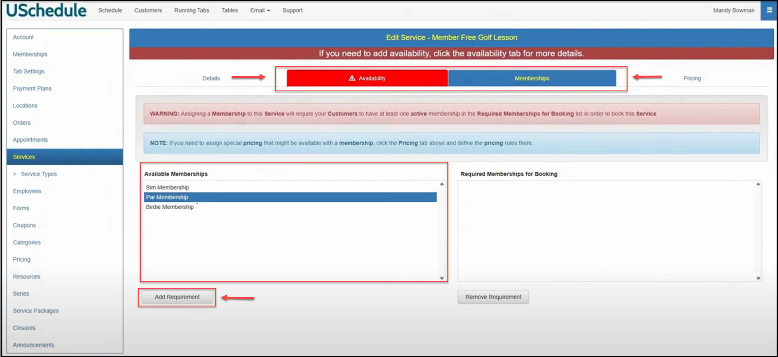 Next, you will need to add Availability and Membership restriction to this service. Select the membership this service will be added to and click Add Requirement:
