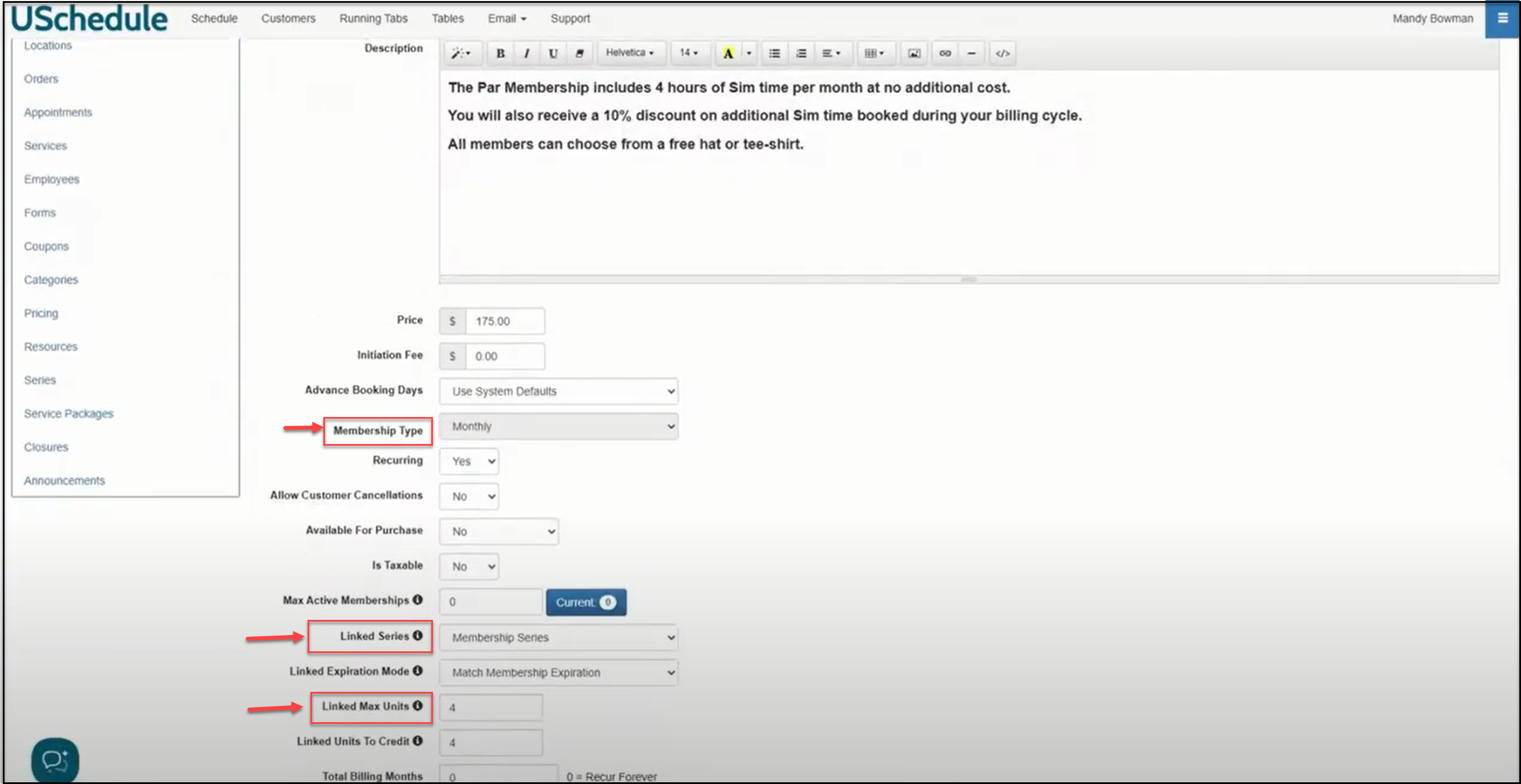 To review the membership you have added the new service to, go the the membership edit page and it will reveal that you have recurring monthly billing and a linked series for four free hours of sim time: