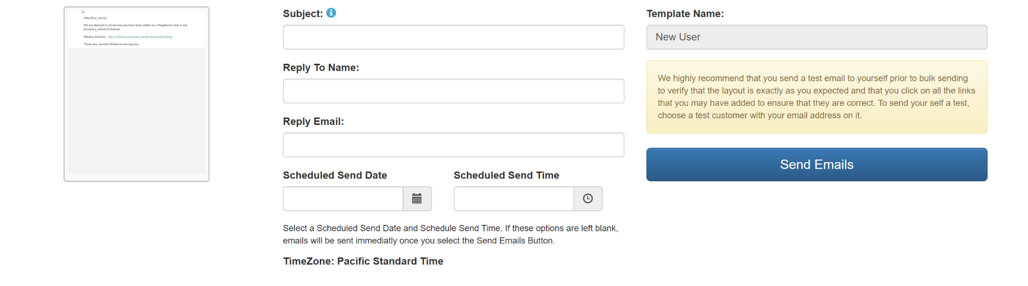 In USchedule’s email platform, you’ll fill in fields for Reply To Name and Reply Email, don’t skip these! Setting a recognizable sender name and a valid reply address is crucial for deliverability: