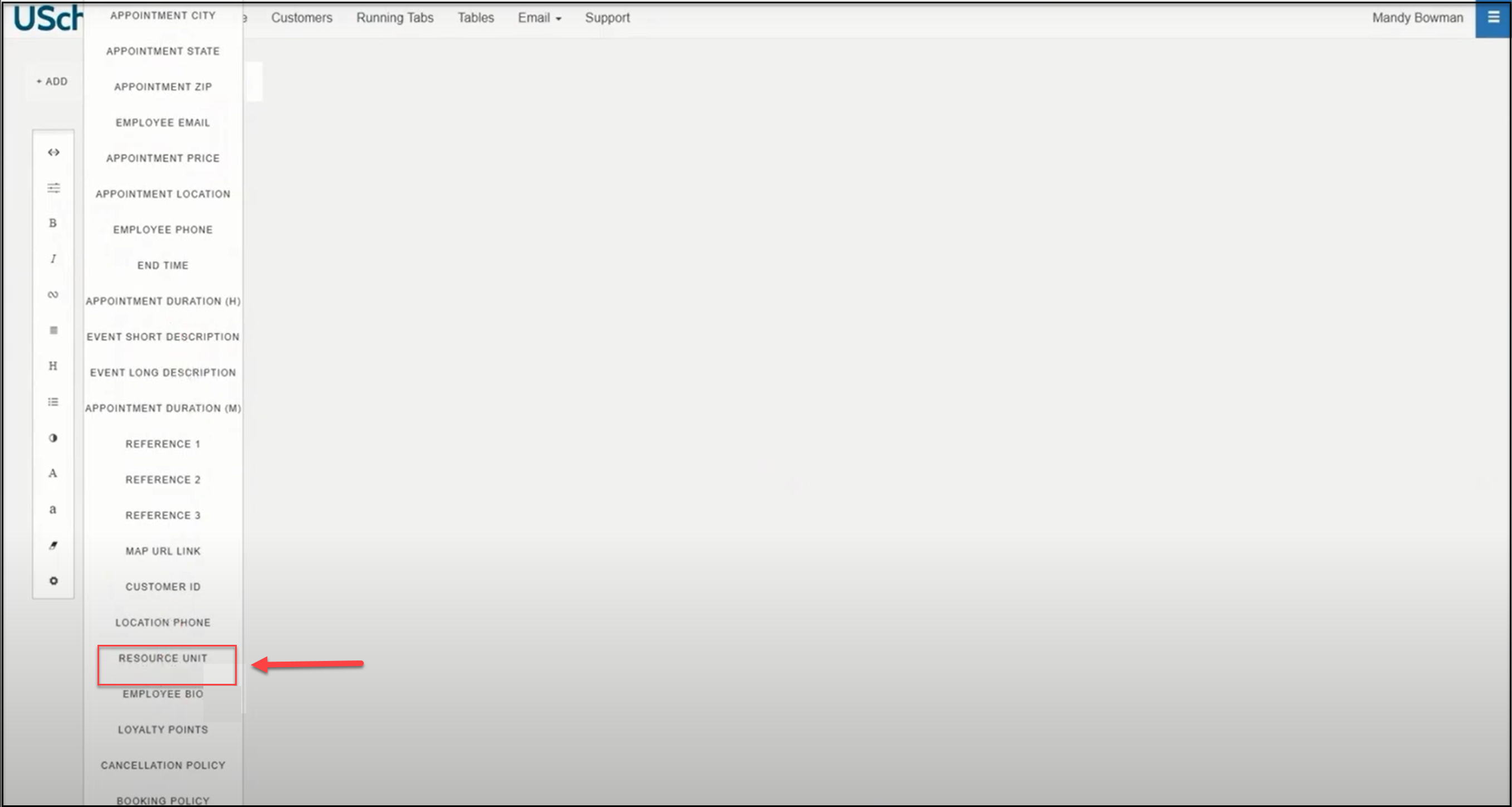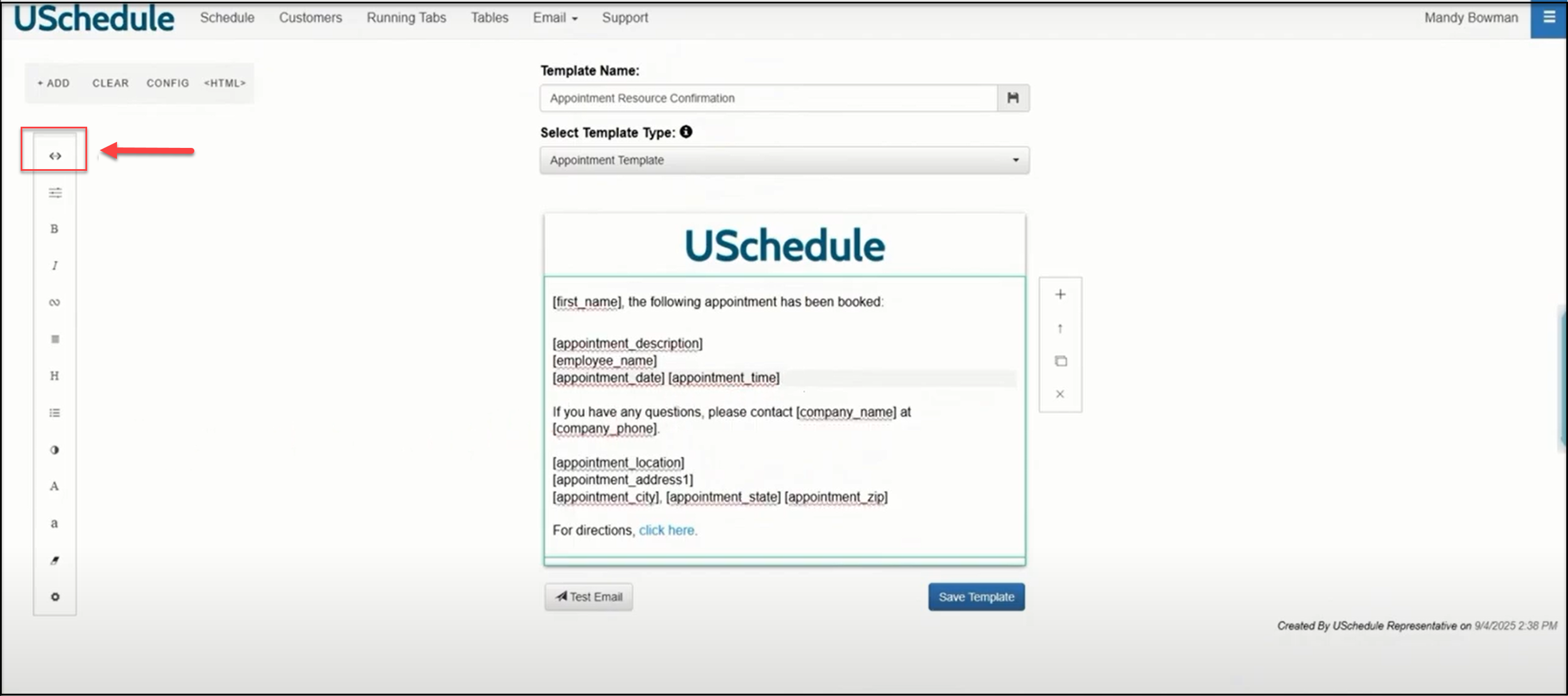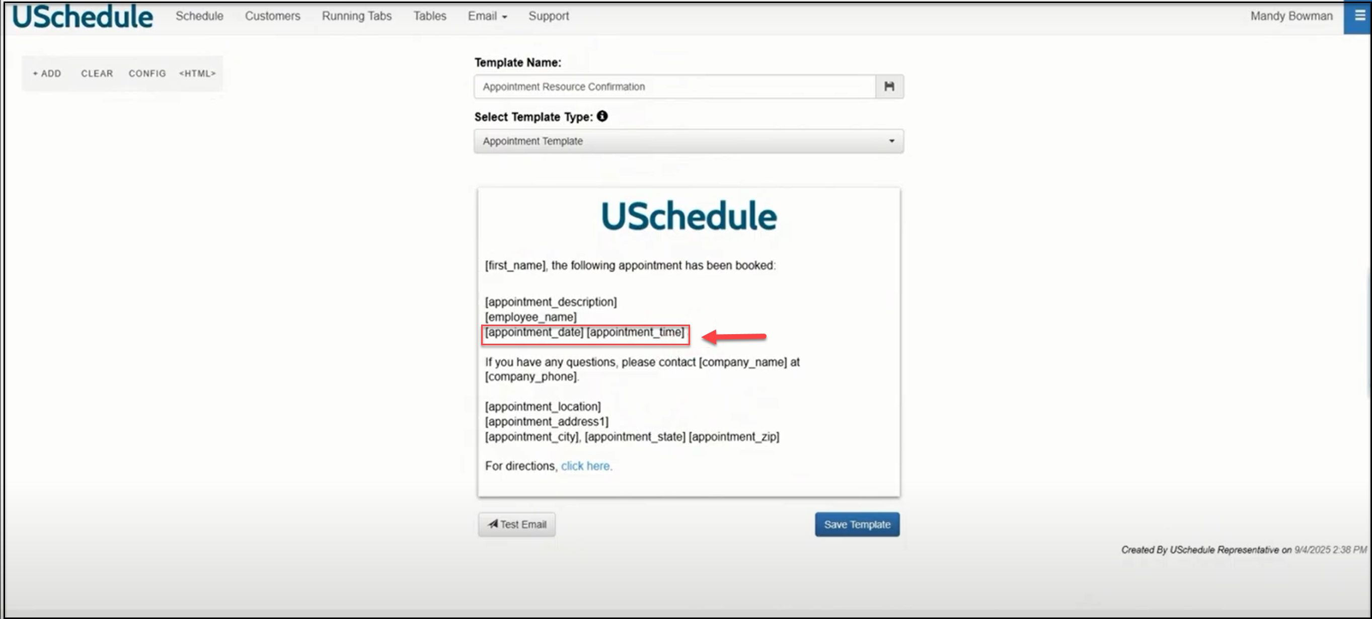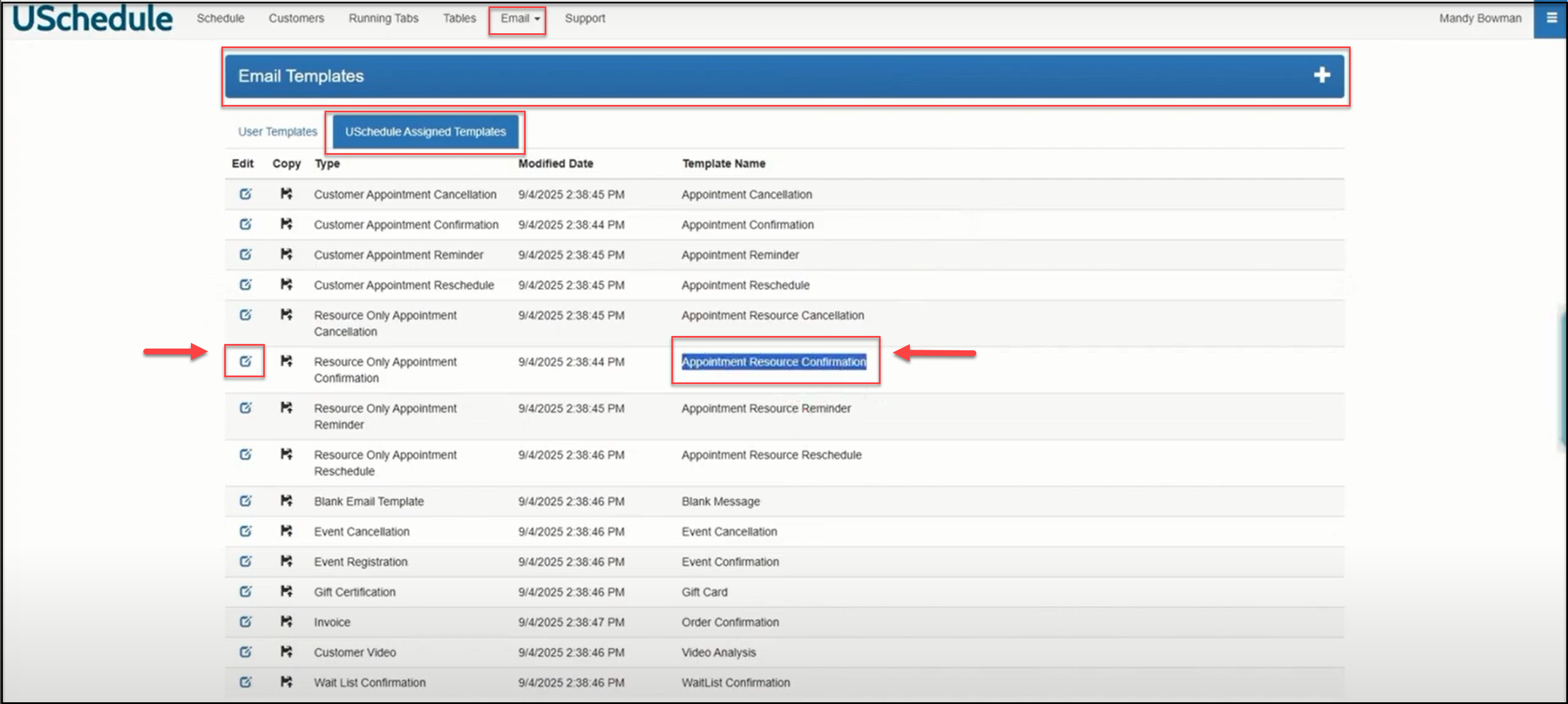 From the Email tab, select Templates and then select USchedule Assigned Templates. Next, edit your Appointment Resource Confirmation template to add a bay or simulator unit number: