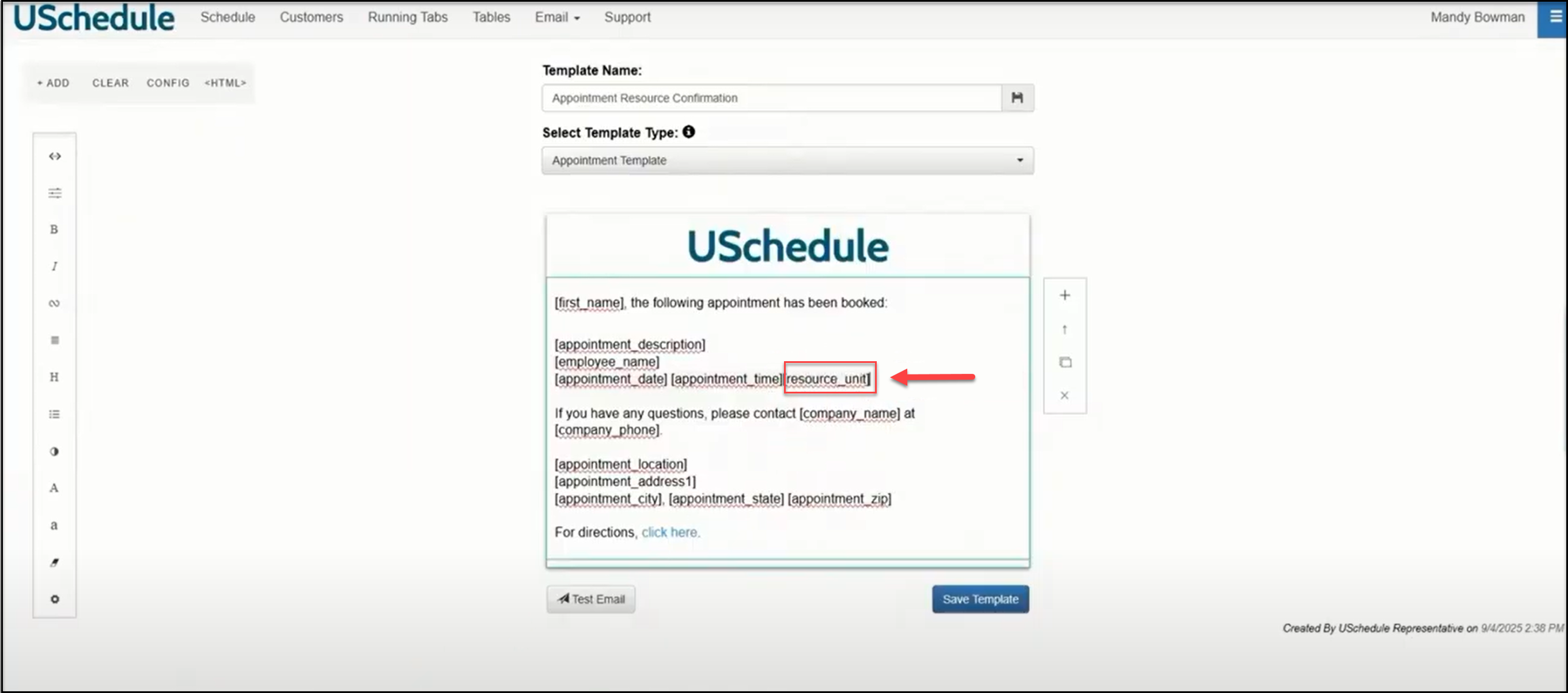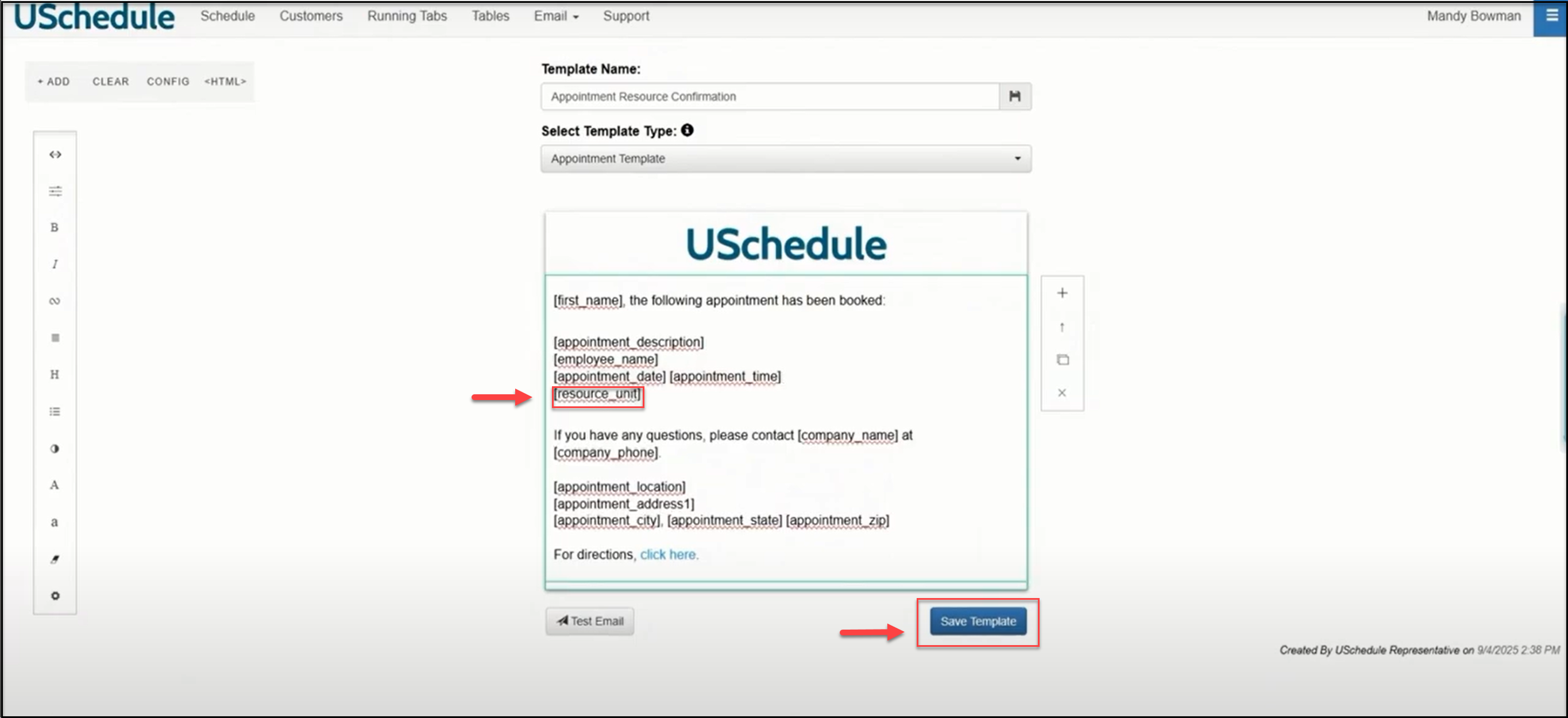 Once saved, the template is ready to use. You might also consider adding the resource unit to your Resource Appointment Reminder template to remind customers of the resource unit they booked into prior to their arrival at the location of the appointment.