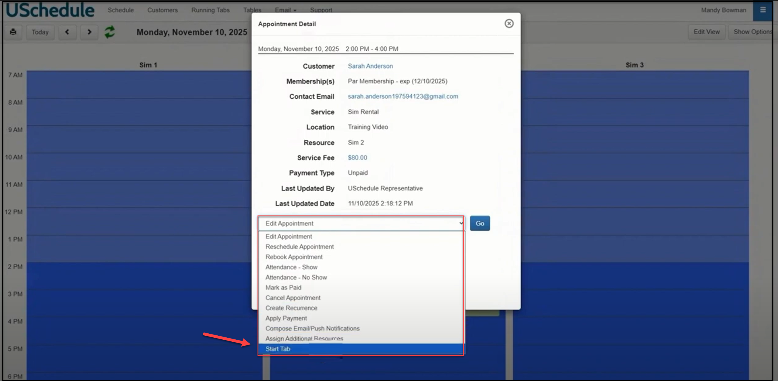 To split an appointment between two or more customers for a simulator rental, click on the appointment and in the dropdown menu, choose the Start Tab option. Click Go to start a tab: