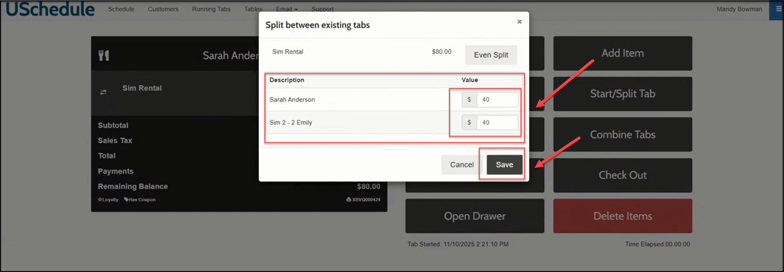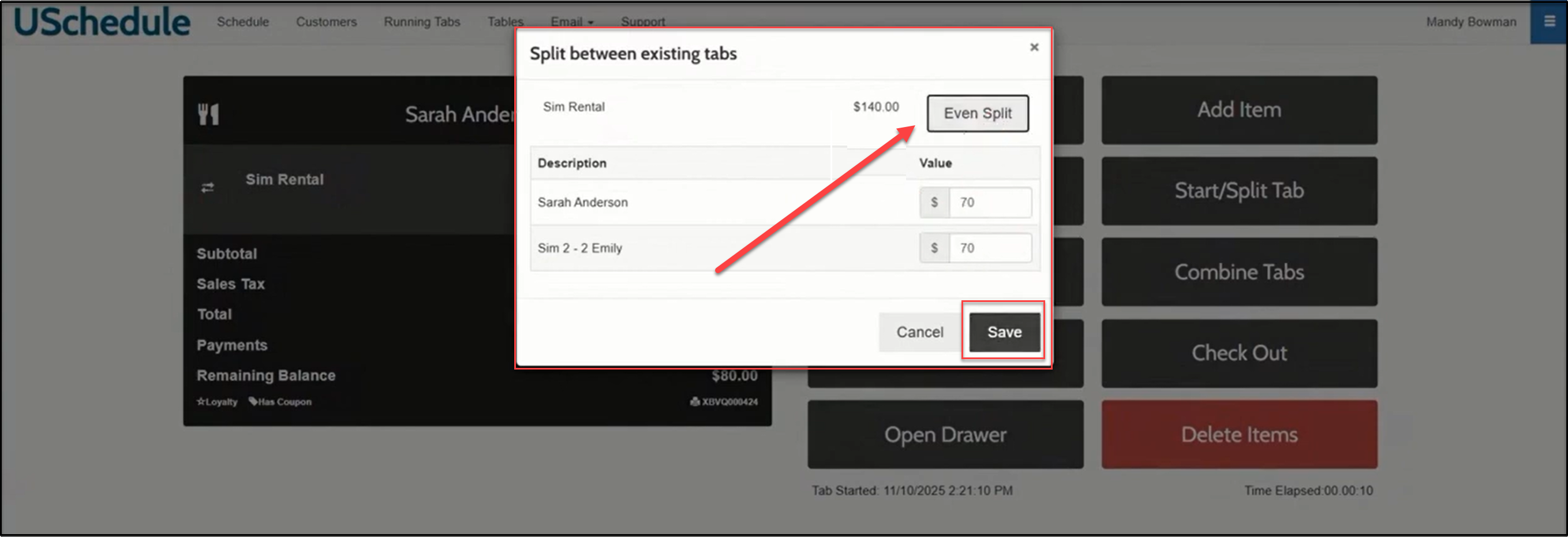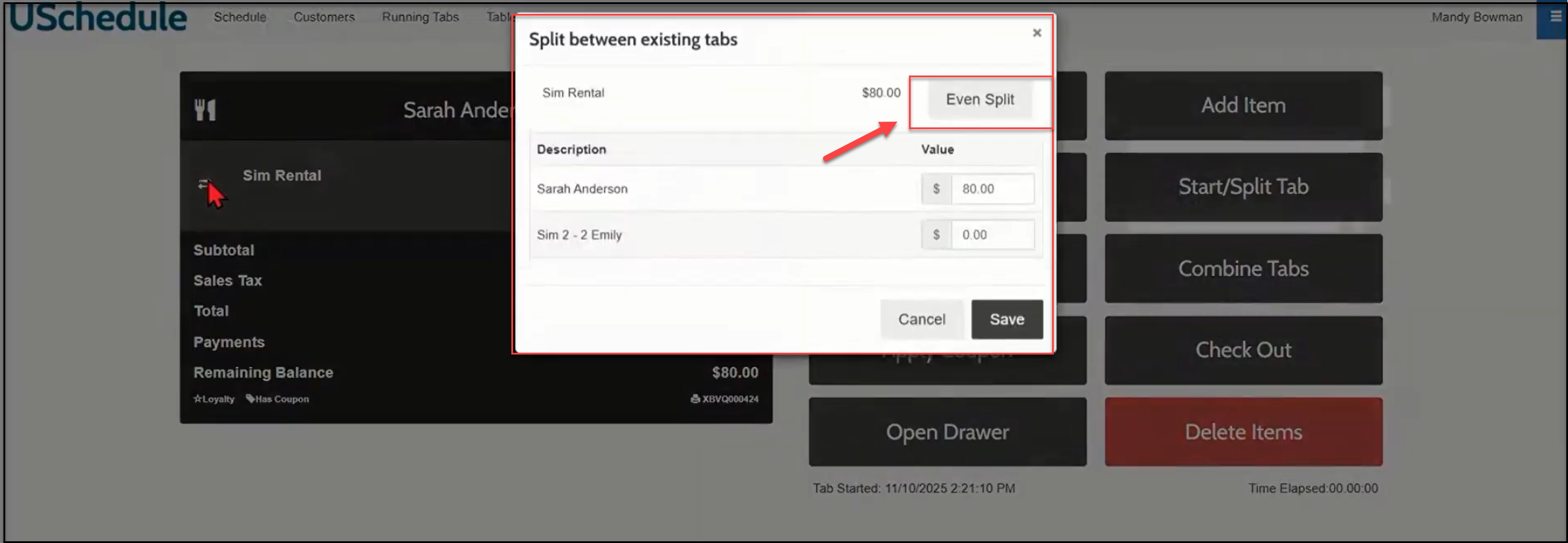 Since a split tab has been created for Emily, half of that money can be put on her tab. Click on the Even Split button: