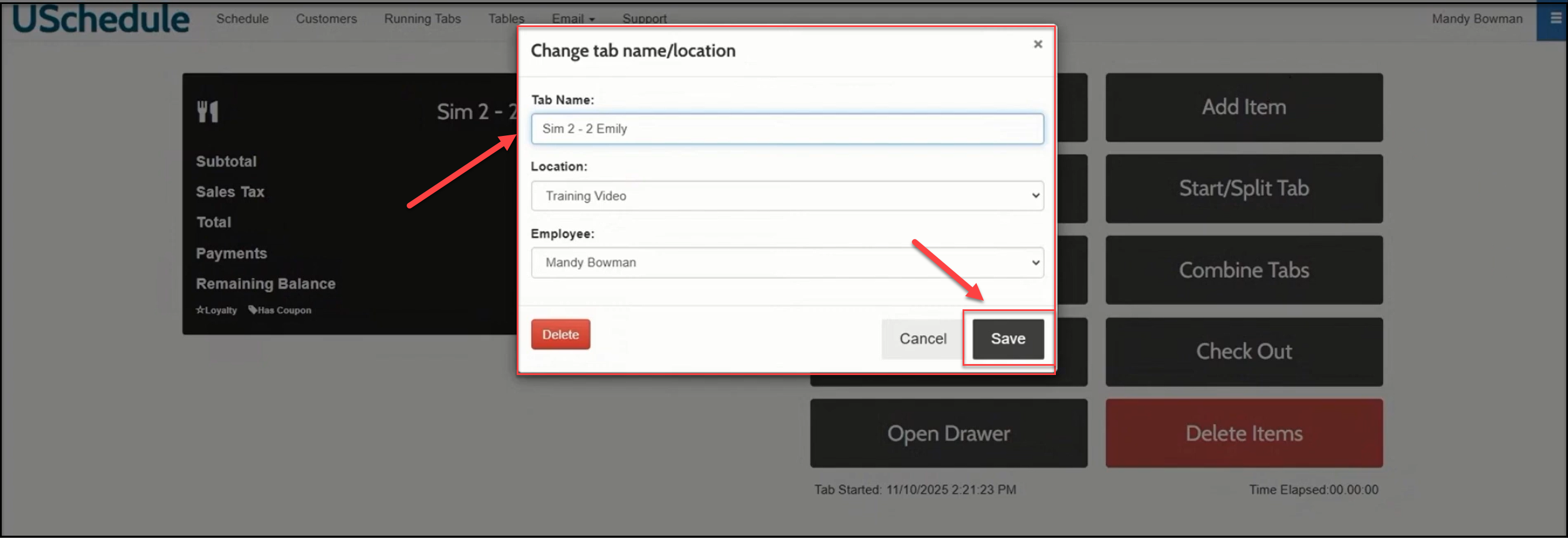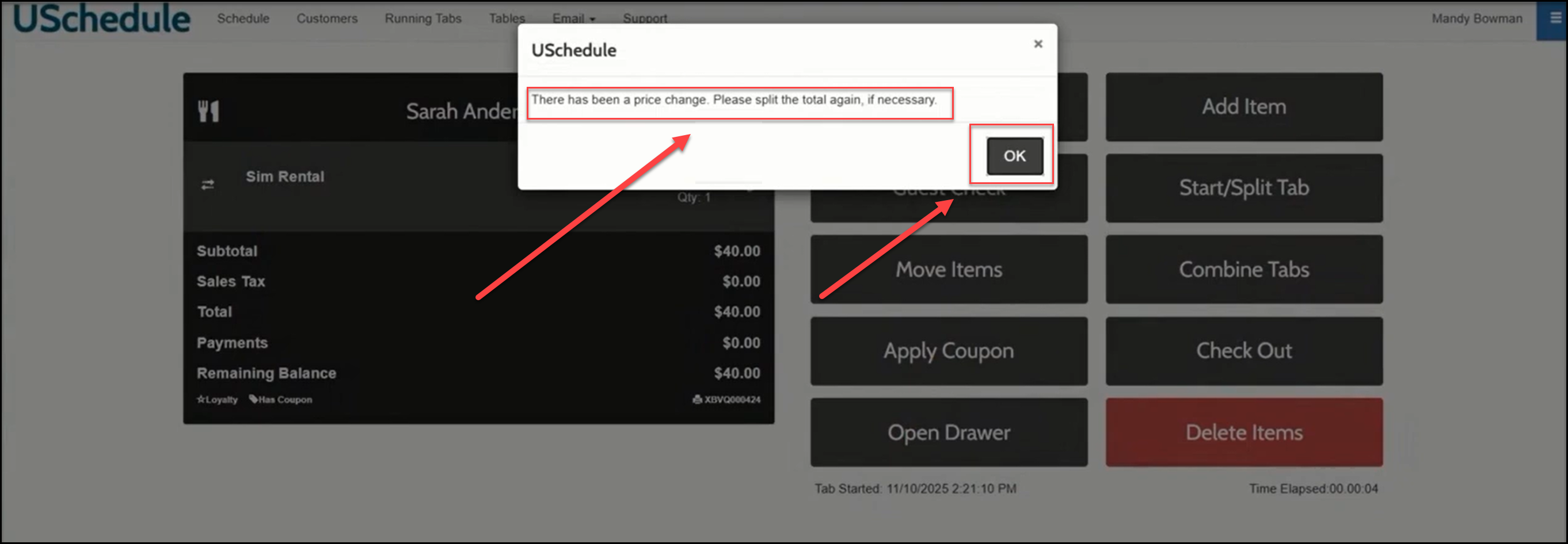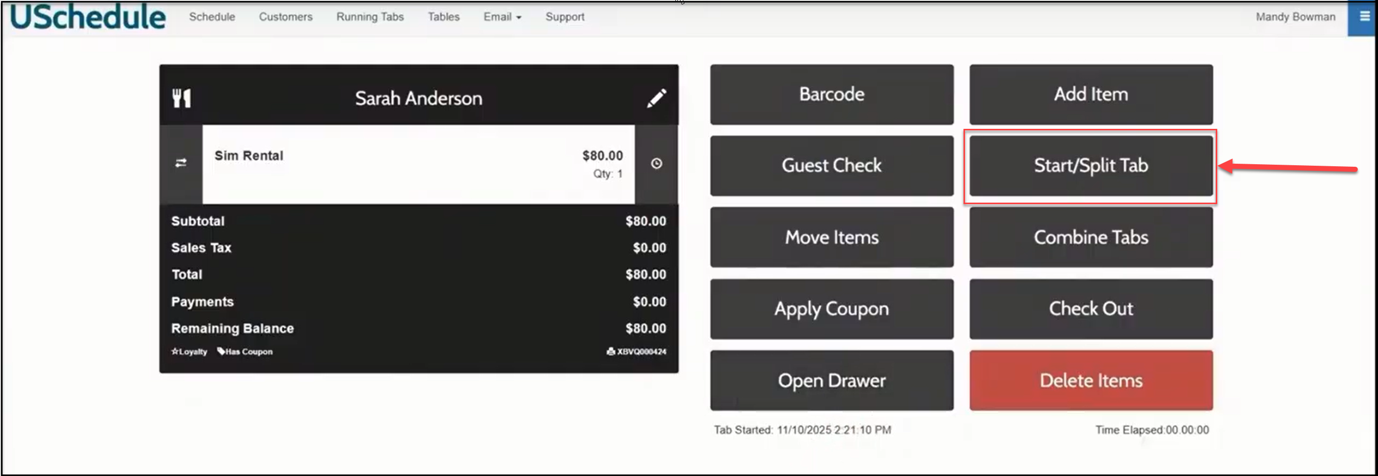 Since a split tab has been created for Emily, half of that money can be put on her tab. Click on the Even Split button: