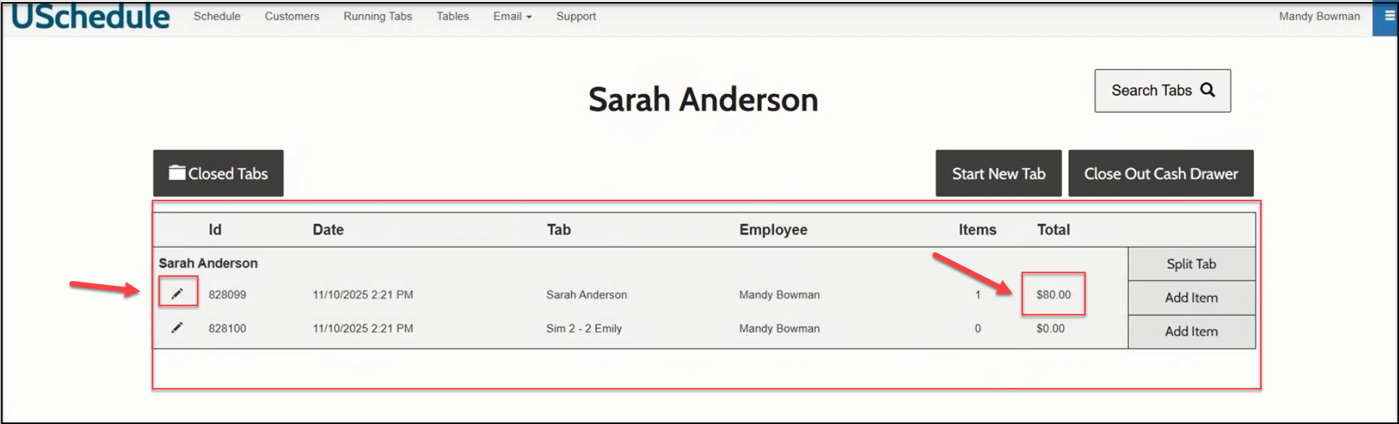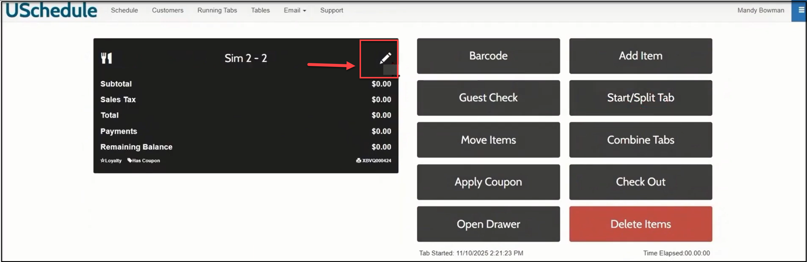 The customer currently has the entire cost on her portion of the tab. To split the cost between the two customers, click on the pencil icon to edit the tab: