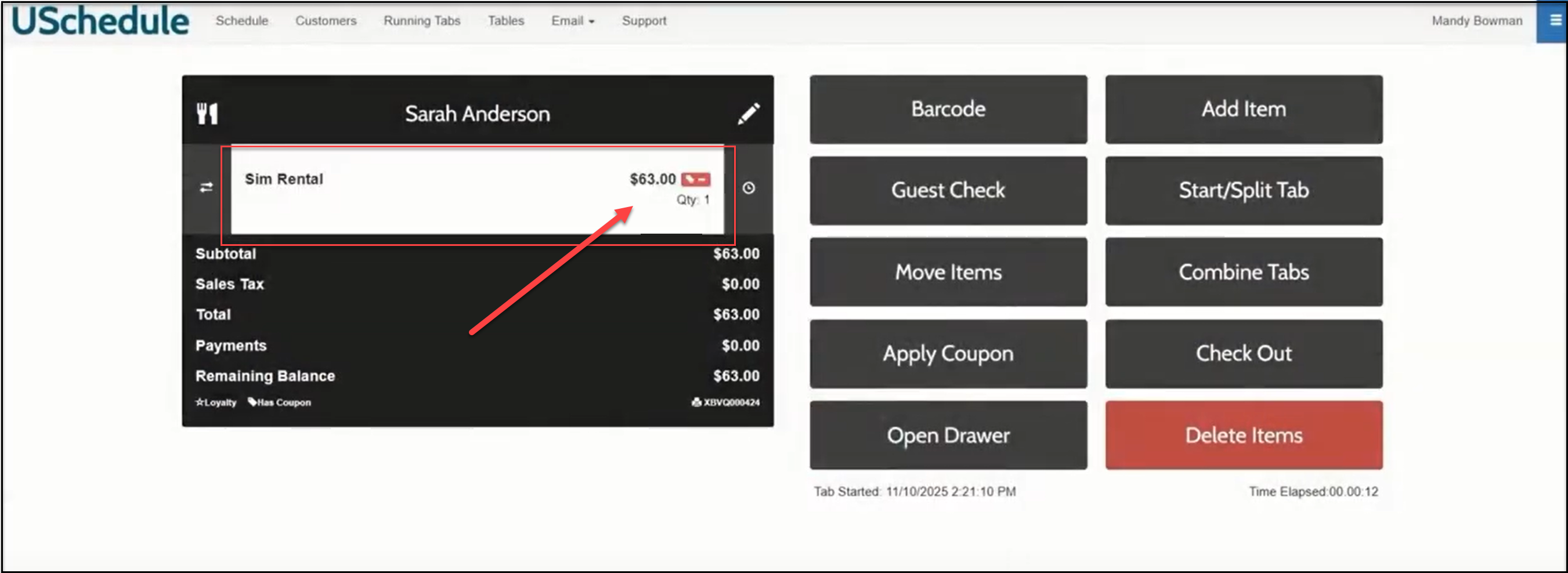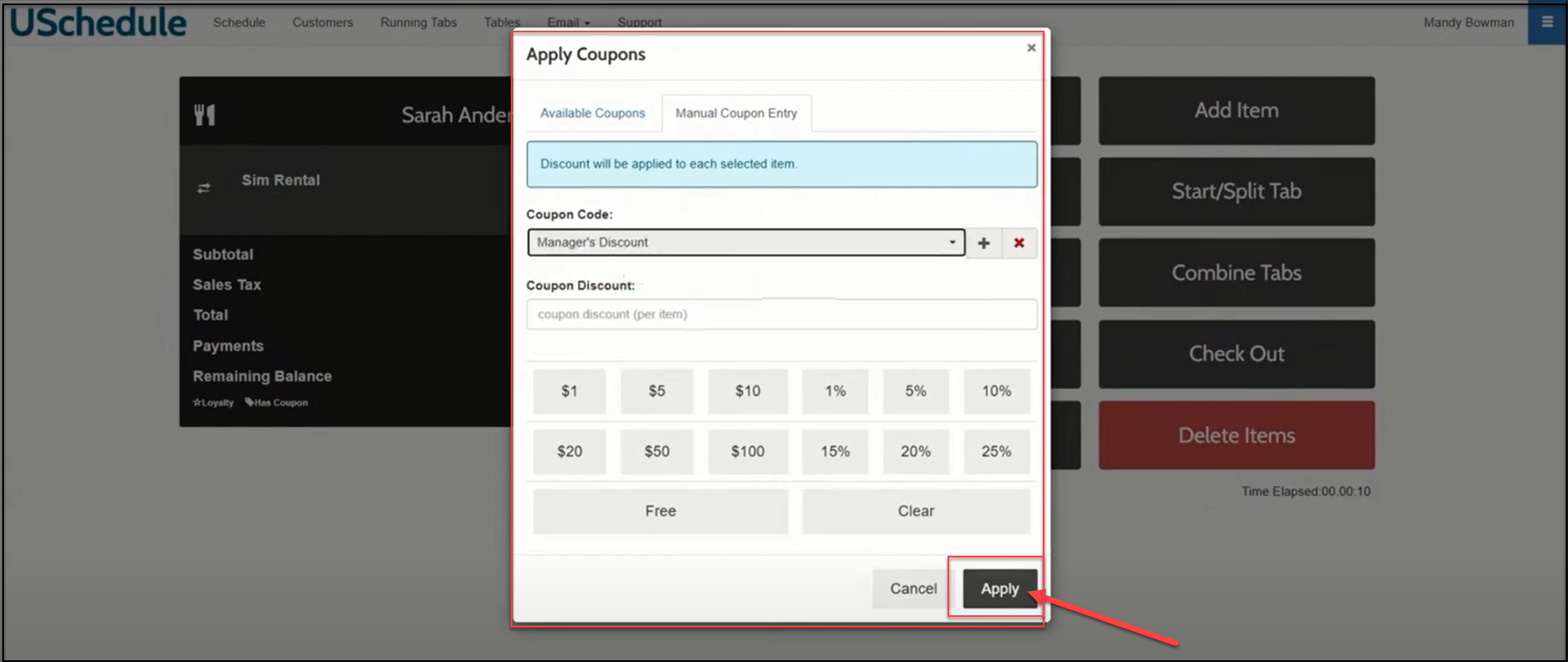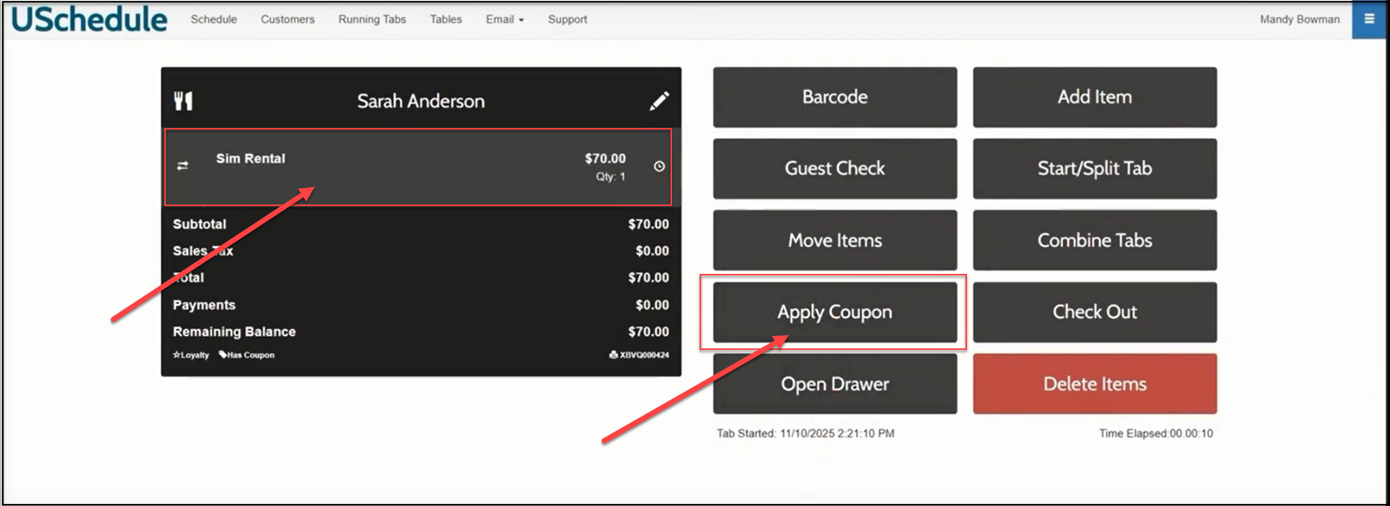 To apply a coupon to this tab, click the item that you would like to apply the coupon to and click the Apply Coupon button: