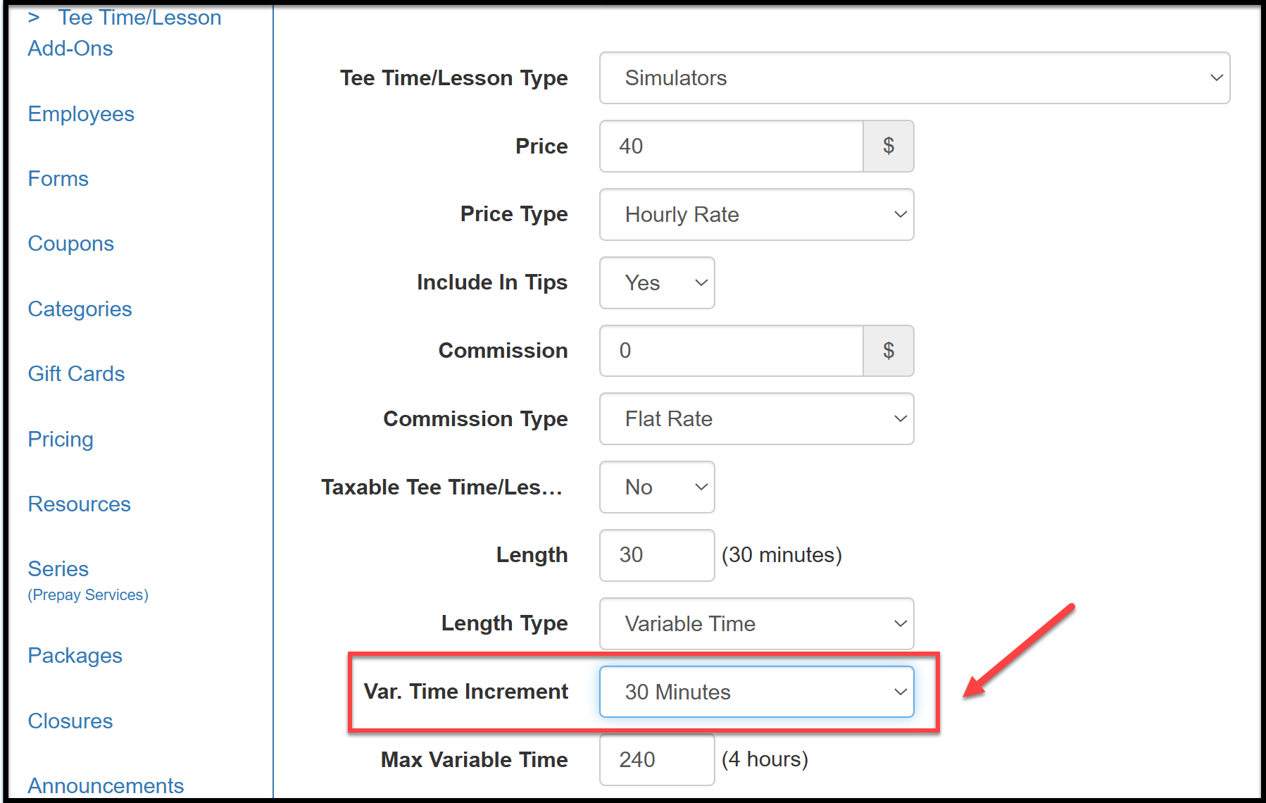 You can edit your Var Time Increment to 30 minutes to allow customers to book on the half hour. To do this, navigate to Settings → Services → Edit, set Var Time Increment to 30 Minutes, and click Save.