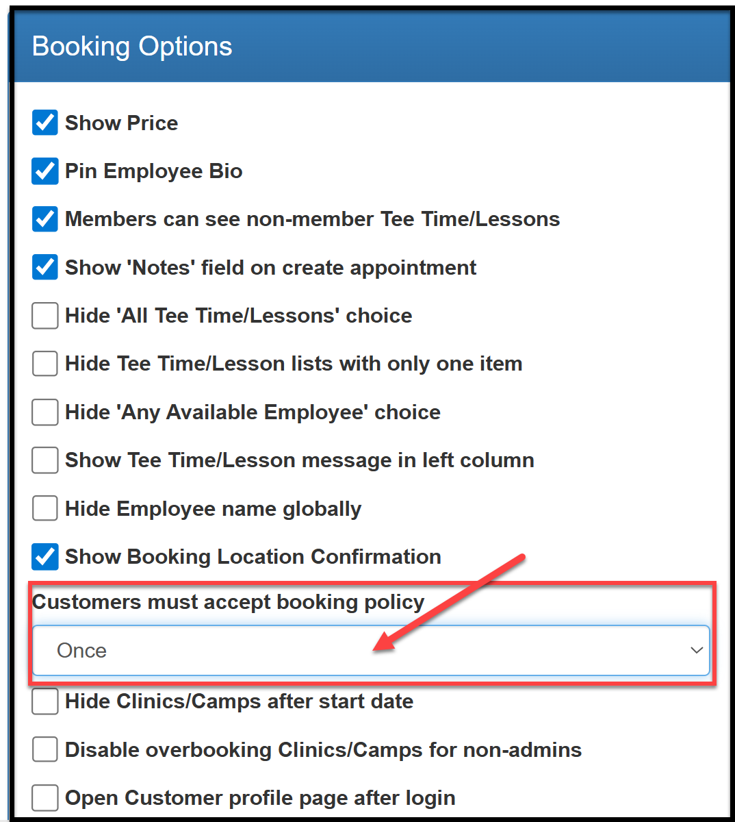Locate the dropdown menu labeled 'Customers must accept booking policy' and select the desired frequency for when customers must view and agree to the booking policy.